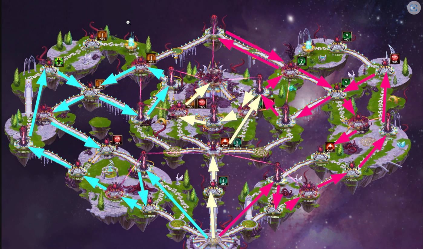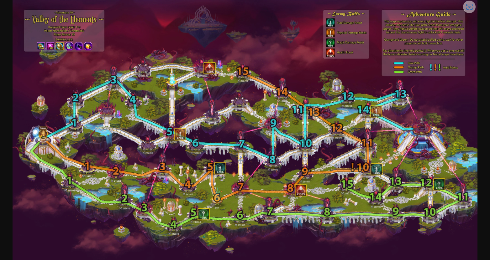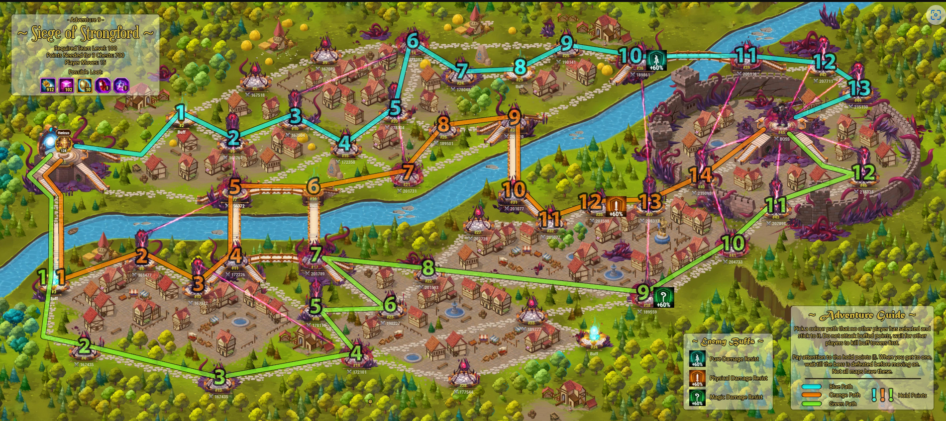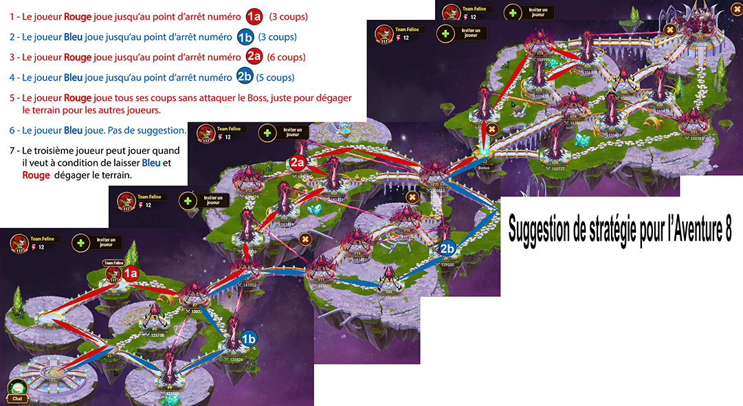 Conseil : Commencé par le trajet Bleu. Ca dégage le terrain pour la personne qui prend le trajet Orange, qui lui même va pouvoir faire tomber 2 tours importantes qui permettront à Bleu et Vert de supprimer les dernières tours de défense du Boss et de l'attaqueren sécurité.